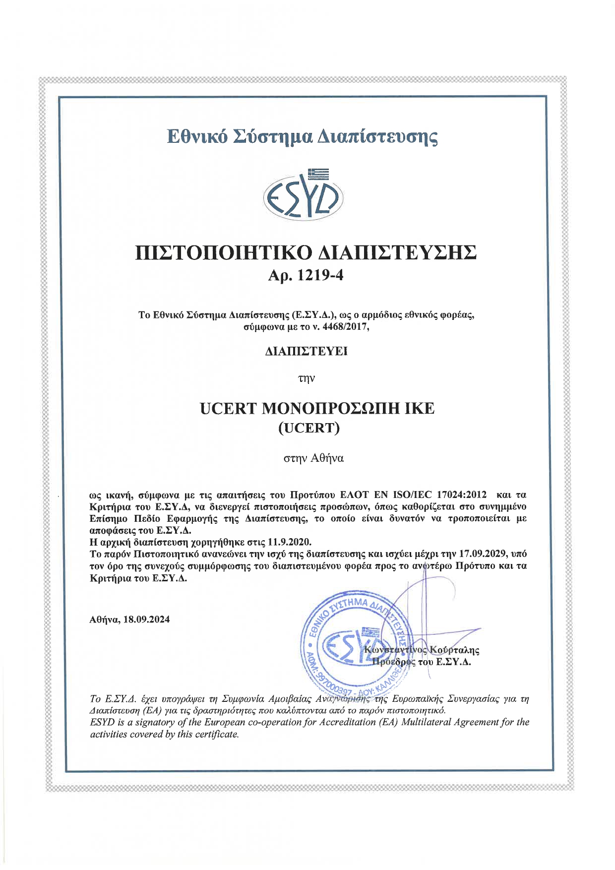 Είναι διαπιστευμένος από το Ε.ΣΥ.Δ. κατά ΕΛΟΤ EN ISO/IEC 17024:2012 (σε 450 σχήματα πιστοποίησης με εξετάσεις που υλοποιούνται διά ζώσης ή/και εξ αποστάσεως) γεγονός το οποίο αποδεικνύει ότι η διαδικασία πιστοποίησης γίνεται με αμεροληψία και με τεκμηριωμένη επάρκεια, καθιστώντας παράλληλα το πιστοποιητικό αναγνωρισμένο και αποδεκτό ως ισότιμο από τους Εθνικούς Φορείς Διαπίστευσης των χωρών – μελών της Ε.Α. (European cooperation for Accreditation).